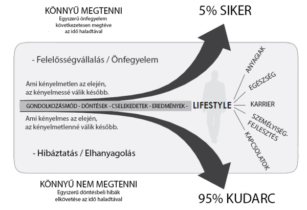 A pozitív görbe a tudatosság, a fegyelem és a hosszú távú gondolkodás útját jelképezi, amihez hozzátartozik az, hogy képesek vagyunk lemondani a rövid távú kényelemről, hogy a jövőnket építsük.